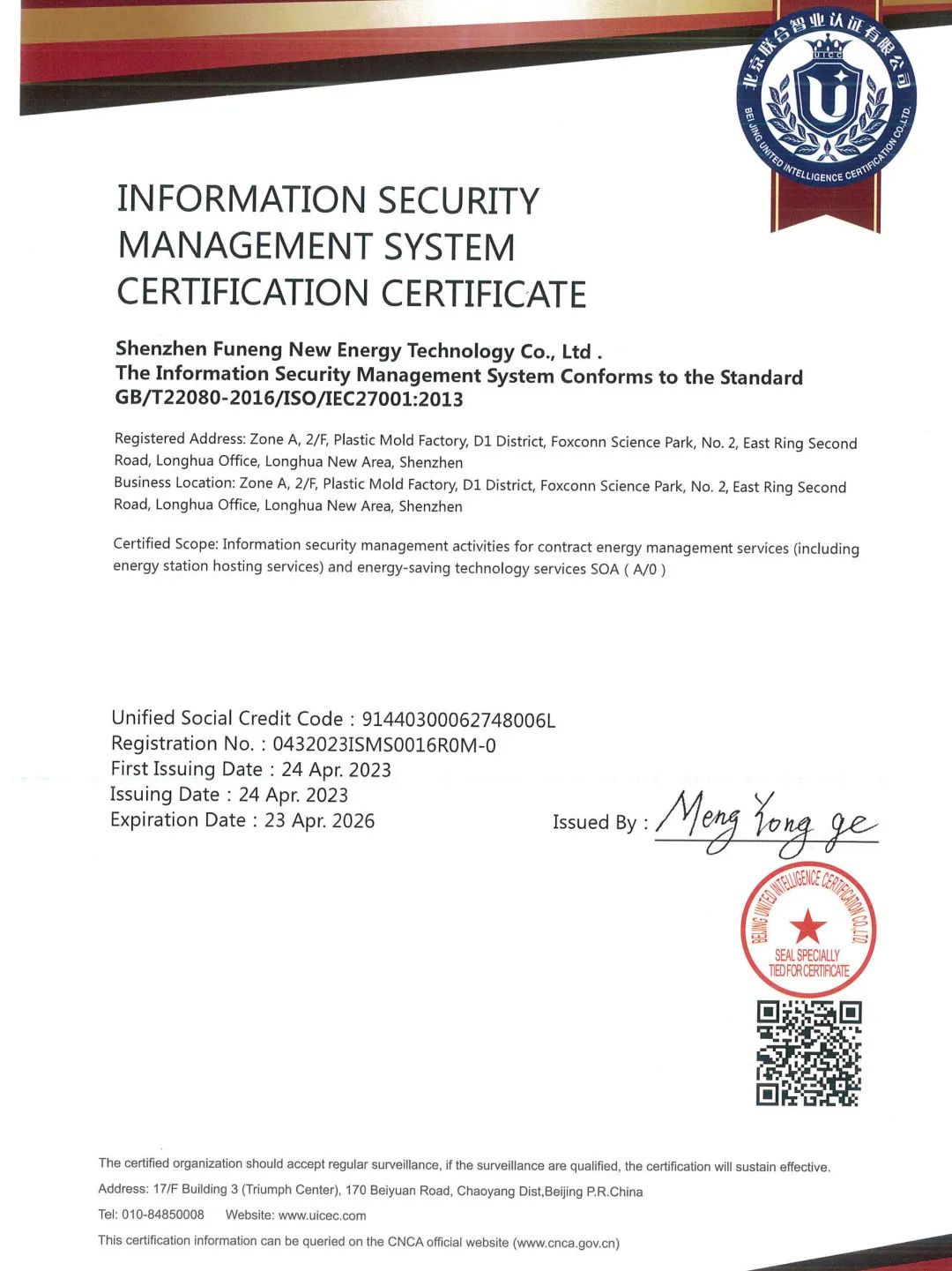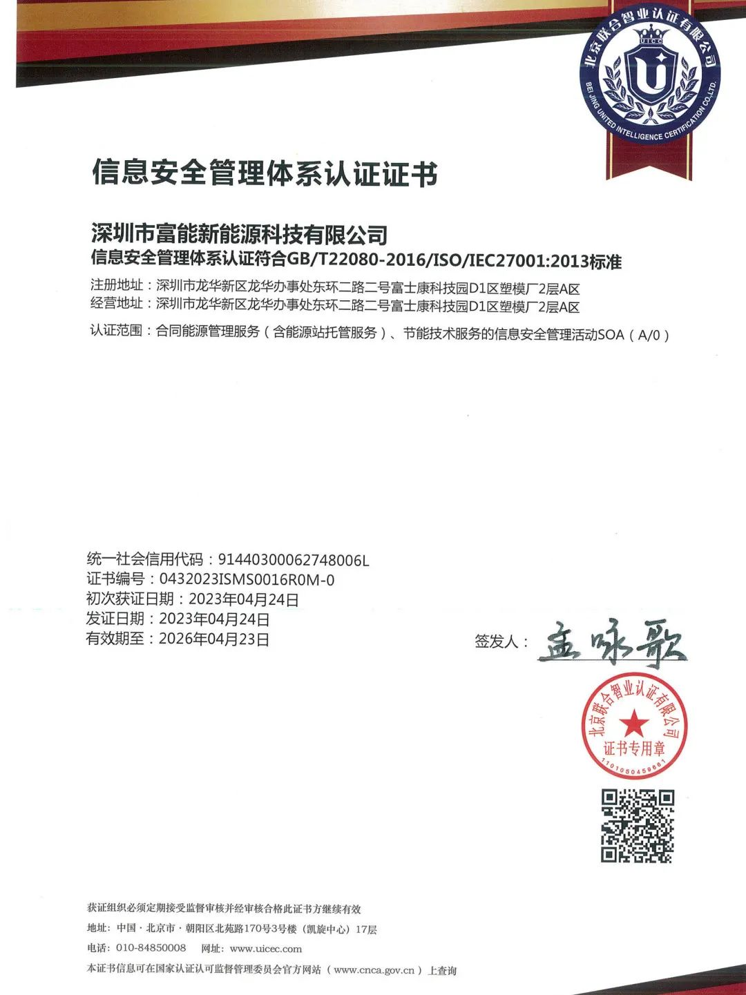 此次榮獲信息安全管理體系認(rèn)證證書,表明富能在為客戶提供合同能源管理服務(wù)、節(jié)能技術(shù)服務(wù)等信息安全管理活動中,已經(jīng)采取了一系列有效的信息安全保障措施,并建立了嚴(yán)格的信息安全管理體系。
