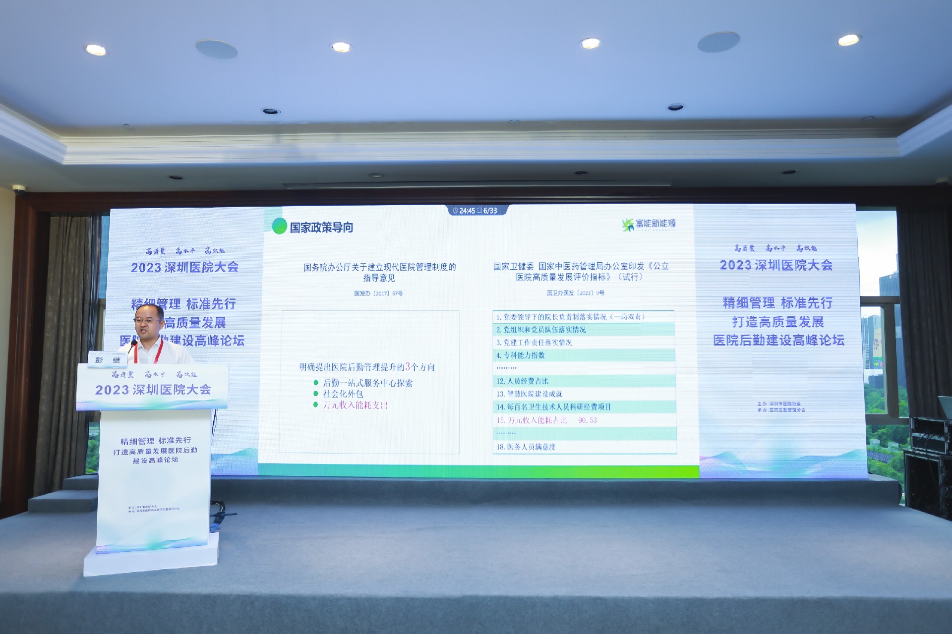 精細管理,標準先行,助力醫(yī)院后勤高質(zhì)量發(fā)展。富能高級副總裁彭繼于分論壇六作《雙碳背景下醫(yī)院節(jié)能降碳路徑》的主題分享。解讀了公立醫(yī)院后勤改革發(fā)展歷程,并分析在國家實施雙碳目標、倡導全社會節(jié)能減排的背景下醫(yī)院能源管理的現(xiàn)狀和痛點,緊緊圍繞醫(yī)院后勤關(guān)注的安全、能耗、成本、管控等方面,結(jié)合富能實例,分享了中央空調(diào)高效制冷機房、燃氣鍋爐余熱回收、高效LED燈改造、光儲充一體化示范方案等智慧綜合能源運維服務解決方案以及節(jié)能減碳的成功經(jīng)驗和技術(shù)。賦能醫(yī)院后勤高質(zhì)量發(fā)展,結(jié)合諸多已落地的實際案例,凸顯頭部物業(yè)領軍企業(yè)的數(shù)字化能源服務引領能力,引發(fā)全場共鳴。