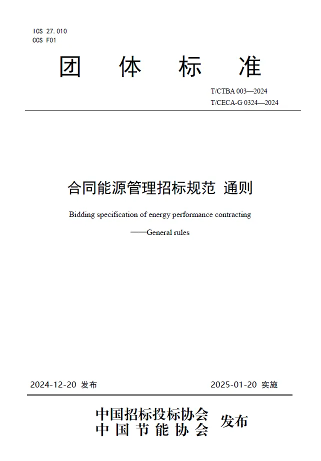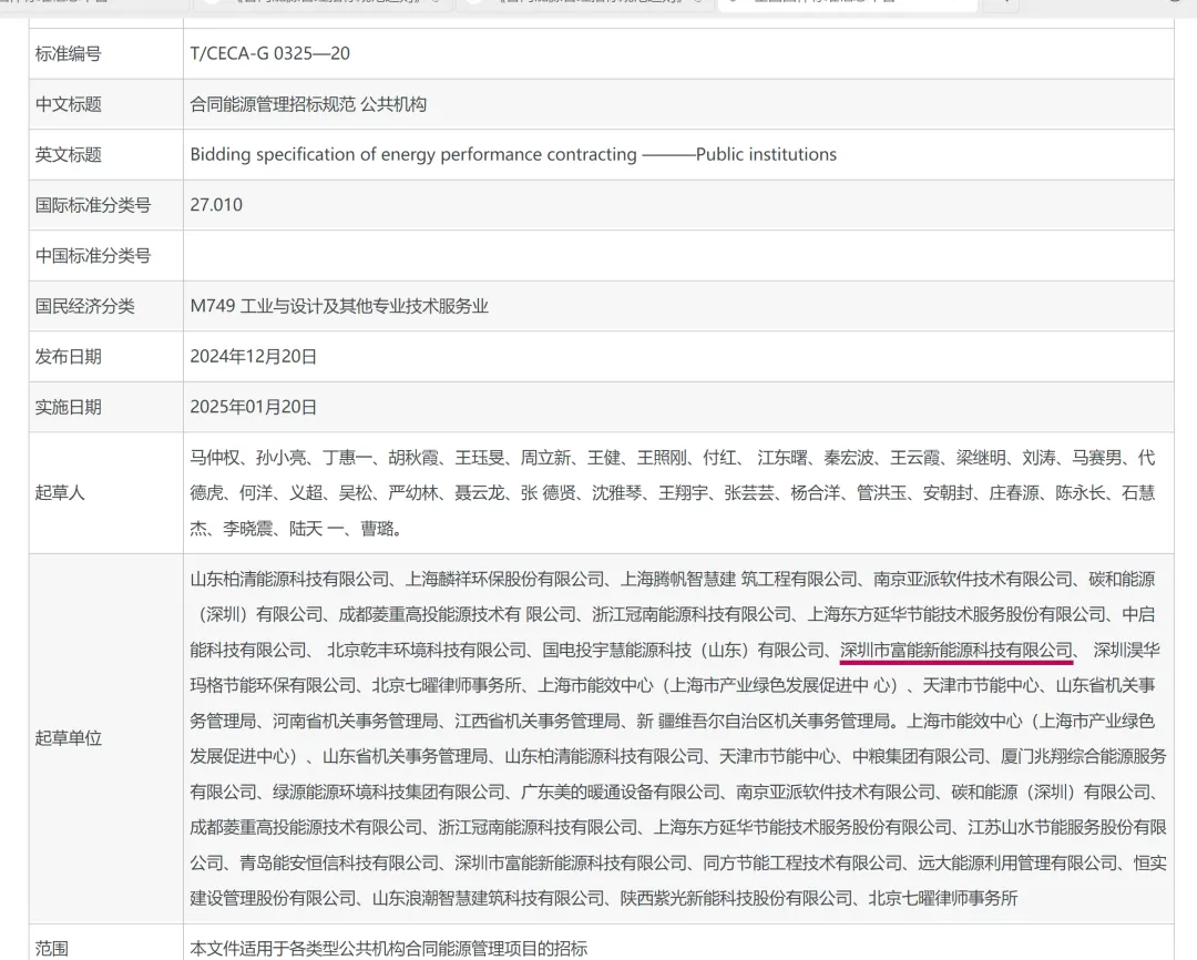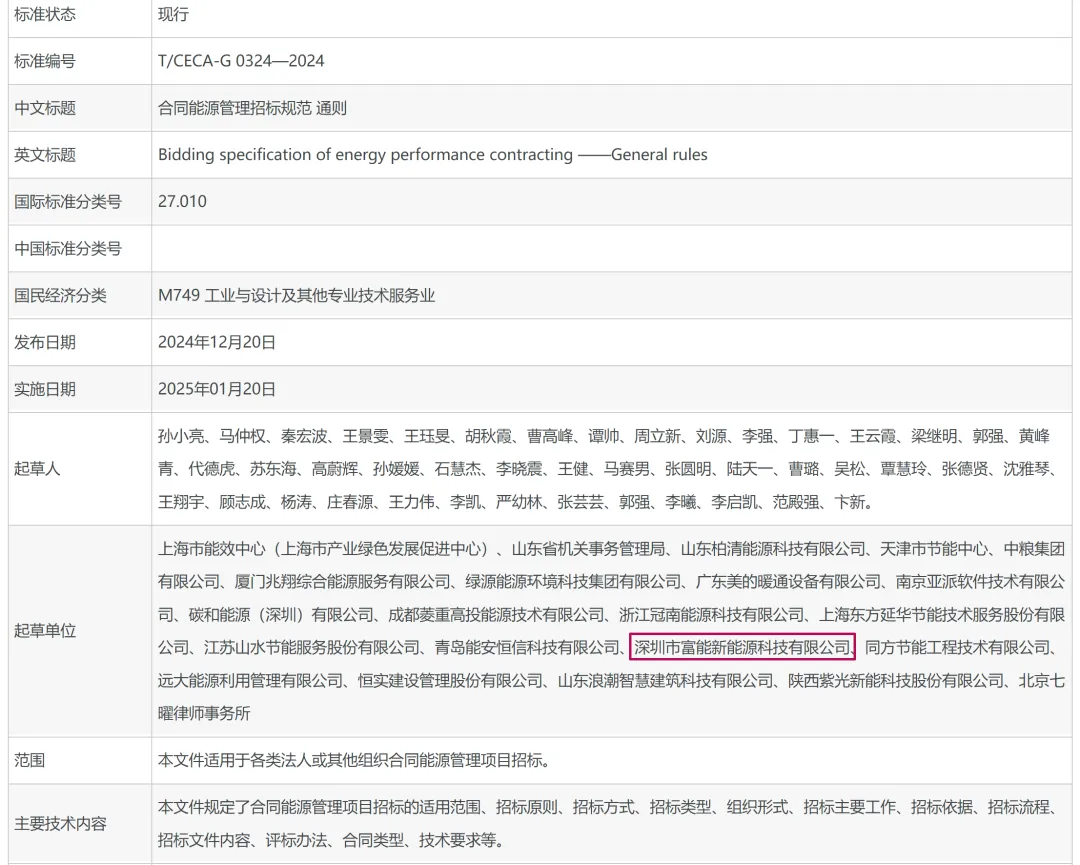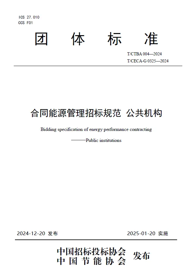 2024年12月20日,由中國招標投標協(xié)會、中國節(jié)能協(xié)會共同歸口,中國節(jié)能協(xié)會節(jié)能服務(wù)產(chǎn)業(yè)委員會組織起草的《合同能源管理招標規(guī)范 通則》《合同能源管理招標規(guī)范 公共機構(gòu)》《合同能源管理招標規(guī)范 軌道交通》三項團體標準正式發(fā)布。富能參與了《合同能源管理招標規(guī)范 通則》《合同能源管理招標規(guī)范 公共機構(gòu)》兩項團體標準制定工作。