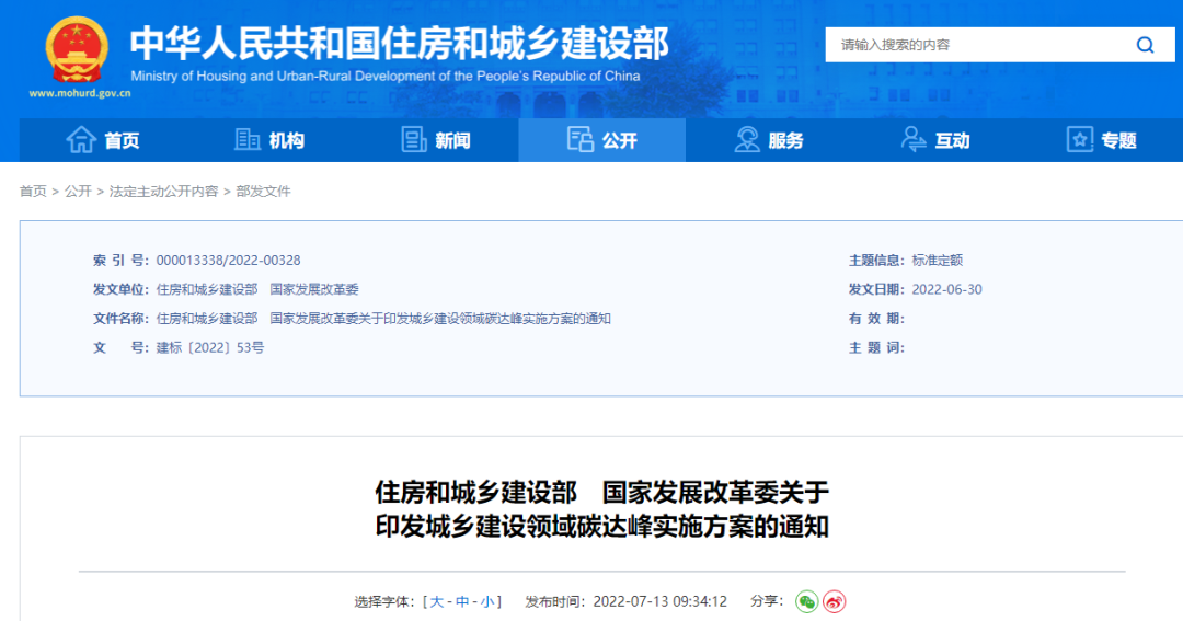 7月13日,住建部、國家發(fā)改委發(fā)布關(guān)于印發(fā)《城鄉(xiāng)建設(shè)領(lǐng)域碳達峰實施方案》的通知。