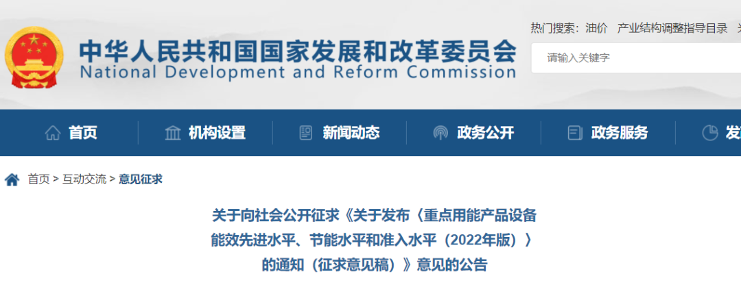 7月21日,國家發(fā)展改革委發(fā)布關(guān)于向社會公開征求《關(guān)于發(fā)布〈重點用能產(chǎn)品設(shè)備能效先進水平、節(jié)能水平和準(zhǔn)入水平(2022年版)〉的通知(征求意見稿)》意見的公告,旨在為提升重點用能產(chǎn)品設(shè)備能效水平,引導(dǎo)生產(chǎn)者提升技術(shù)工藝水平、督促使用者加快淘汰落后設(shè)備,鼓勵消費者擴大綠色產(chǎn)品消費。