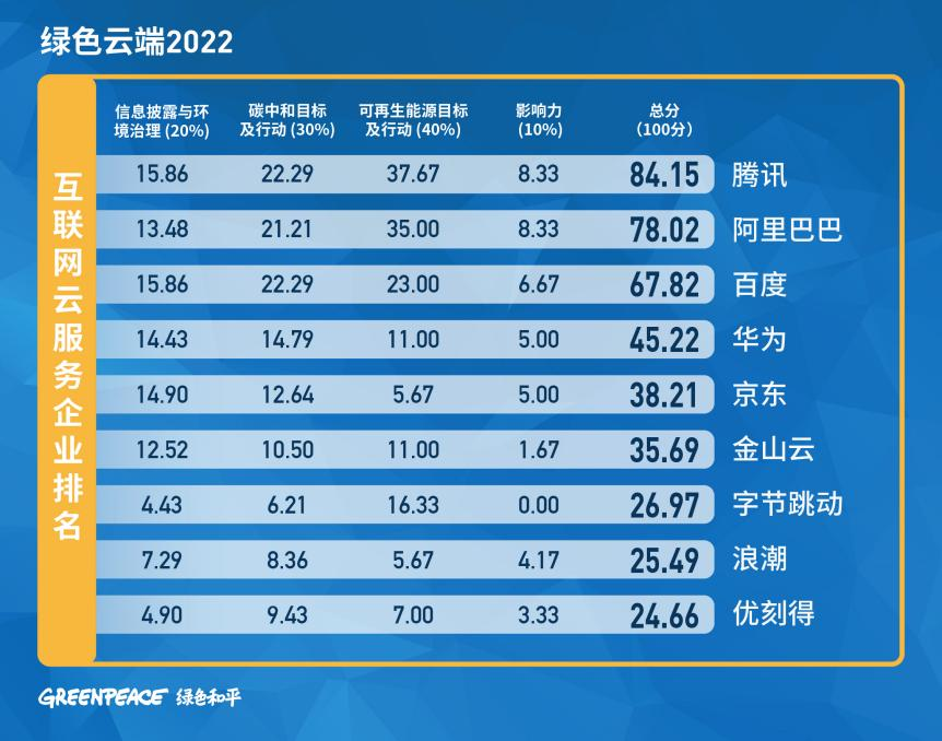 7月12日, 國際環(huán)保機構(gòu)綠色和平與中華環(huán)保聯(lián)合會共同發(fā)布《綠色云端2022》報告(以下簡稱“報告”),對國內(nèi)24家領(lǐng)先互聯(lián)網(wǎng)云服務(wù)與數(shù)據(jù)中心企業(yè)的碳中和表現(xiàn)進行排名。