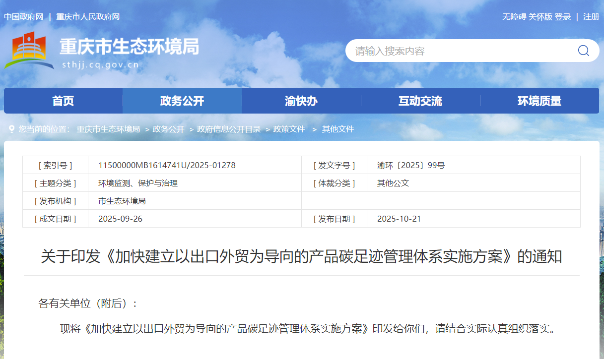 重慶市生態(tài)環(huán)境局等十五部門 關(guān)于印發(fā)《加快建立以出口外貿(mào)為導(dǎo)向的產(chǎn)品碳足跡管理體系實施方案》的通知